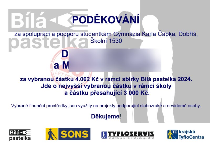 V rámci sbírky Bílá pastelka se nám podařilo vybrat významnou částku, která se v rámci Středočeského kraje zařadila mezi pět nejvyšších výtěžků na podporu Tyfloservisu. Oproti loňskému roku jsme dosáhli téměř dvojnásobku vybrané částky – 11 440 Kč. Obrovské poděkování zaslouží studentky M. K. a B. H., které společně vybraly rekordních 4 062 Kč.