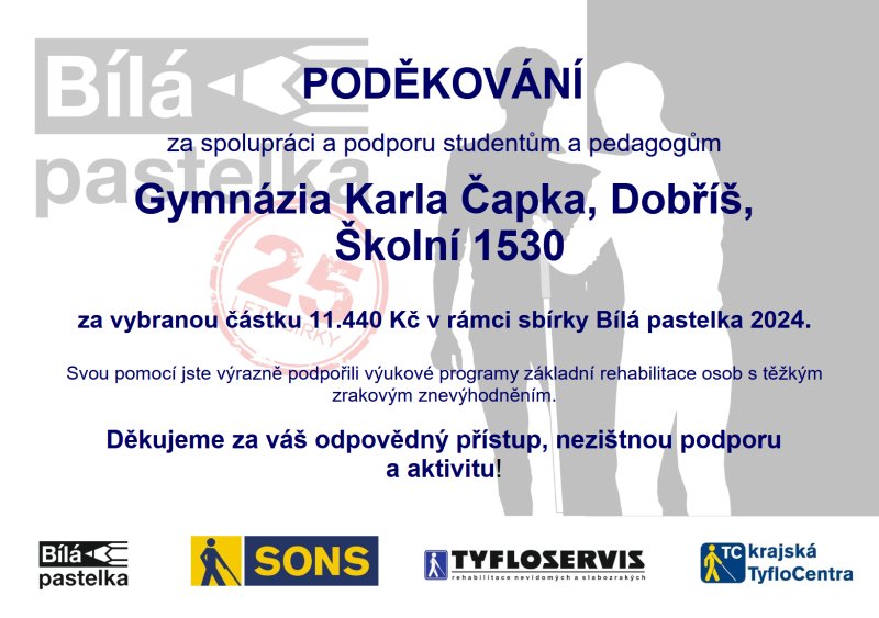 V úterý 15. října 2024 proběhla na Gymnáziu Karla Čapka sbírka Bílá pastelka, kterou pořádá společnost SONS a Tyfloservis. Výtěžek ze sbírky je určen pro nevidomé a slabozraké, na výcvik vodících psů, nácvik chůze s bílou holí, výuka obsluhy počítačů apod.