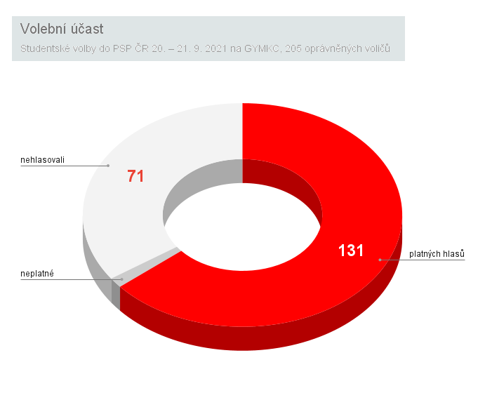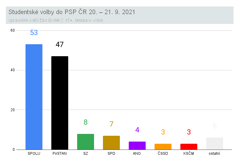 V pondělí 20. září a úterý 21. září 2021 proběhly na některých českých středních školách studentské volby simulující skutečné volby do poslanecké sněmovny. Projekt organizovaný JSNS (Jeden svět na školách) uskutečnila každá škola podle svého uvážení. Na našem gymnáziu se hlavních příprav zhostila studentská rada. V rámci schůzek tvořila volební plakáty a také připravovala volební místnost. K tomuto účelu posloužila učebna výtvarky vylepšená o státní vlajku a státní znak, o volební zástěnu, urnu a stůl pro volební komisi. Ta byla složena ze zástupců studentské rady z 2. a 3. ročníku a oktávy. Samotné volby probíhaly o přestávkách. Volit mohli pouze studentky a studenti starší patnácti let.