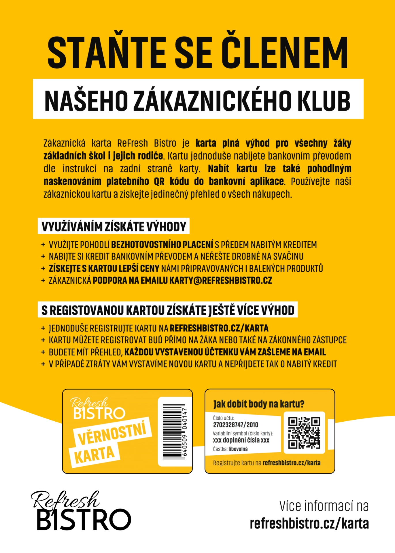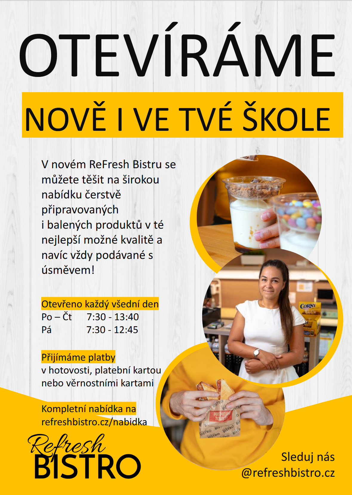se začátkem školního roku měníme provozovatele školního bufetu. Nově bude fungovat pod značkou ReFresh Bistro. Věříme, že tento bufet přinese do naší školy čerstvé a kvalitní potraviny, které si získají oblibu u všech žáků naší školy. Bufet zahájí provoz 9. září.