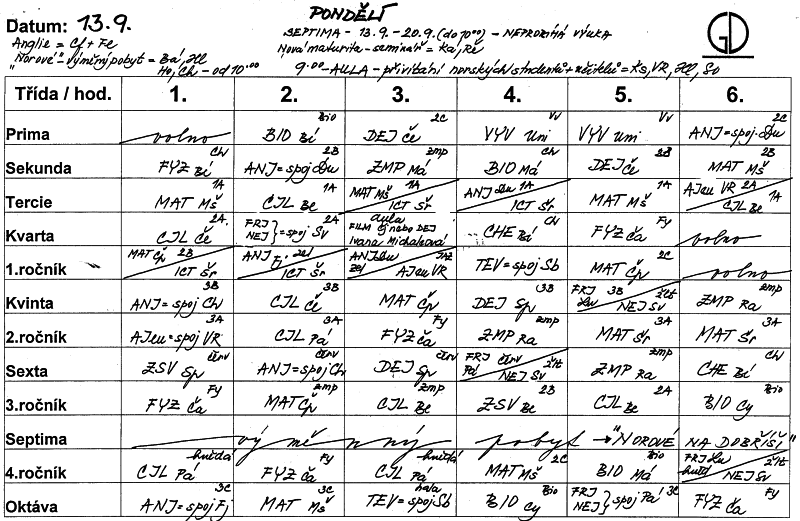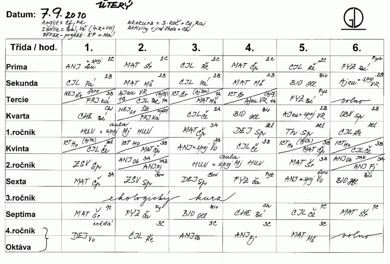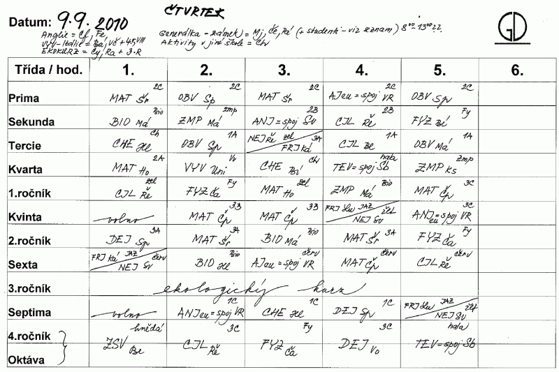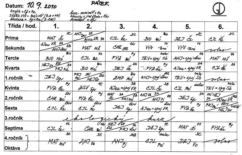 Rozvrhy hodin pro školní rok 2010/11 jsou již na svém obvyklém místě - viz ikona rozvrhu v profilu třídy (musíte být přihlášeni). Do 13. září budou vytvářeny provizorní rozvrhy.