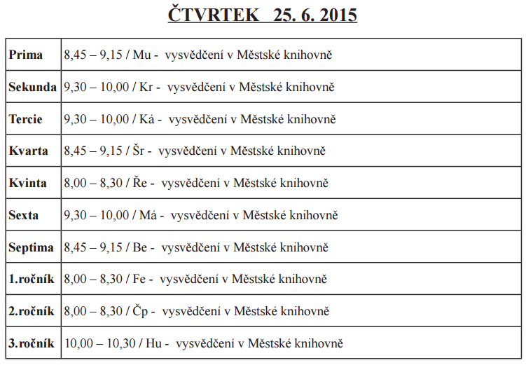 Z důvodu rozsáhlé rekonstrukce bude v následujících dvou týdnech probíhat výuka mimo budovu školy. Předávání vysvědčení se uskuteční v Městské knihovně Dobříš, a to ve čtvrtek 25. června (dle časového harmonogramu). Na pátek 26., pondělí a úterý 29. a 30. června bude vyhlášeno ředitelské volno pro žáky školy. Podrobnější informace naleznete v tomto souboru.