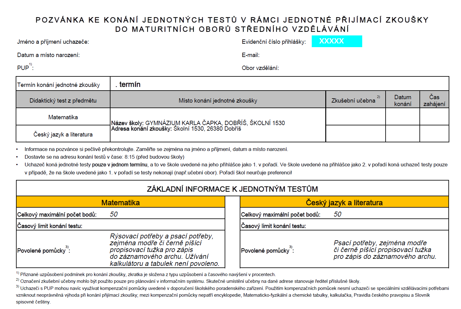 Pozvánky k jednotným přijímacím zkouškám byly odeslány na e-mailovou adresu zákonných zástupců (uvedenou na přihlášce uchazeče) 31. března v 7.36. Potvrďte prosím přijetí pozvánky dle pokynů v e-mailu.